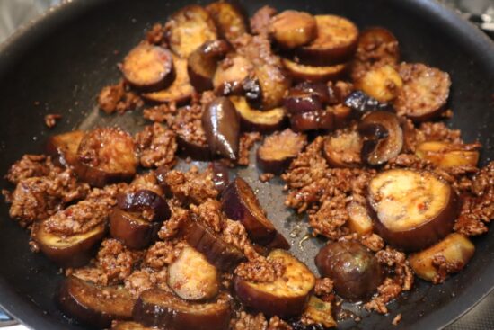 2.フライパンに油(大さじ1)を引いてナスとひき肉を炒める。